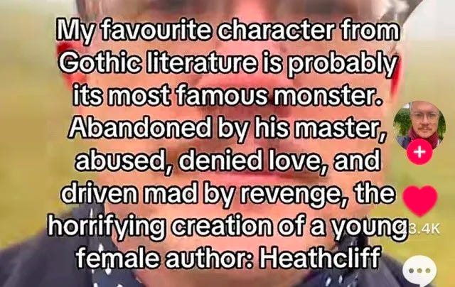I see this issue constantly in the “is it a love story” debate. On the one hand, for anyone to imagine Wuthering Heights as a simple forbidden romance is baffling; it’s really a demoralizing, wretched read3, and I can’t picture anyone thinking it’s appealing as a romance besides perhaps the 14-year-olds reading it for school (and while I have the utmost respect for 14-year-olds’ startling tastes, we must acknowledge that this is not an interpretation for adults).