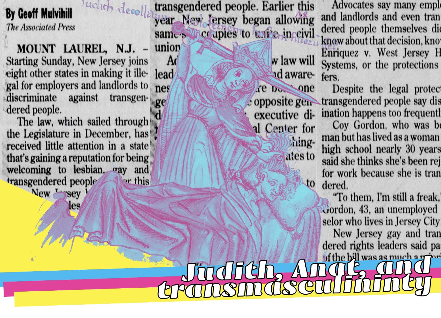 A monastic or otherwise ascetic life occurs repeatedly in these early Christian transmasc stories, and it is no accident that it would be appealing from the perspective of the saints. Asceticism frequently involves casting away “frivolous” things (which, under patriarchy, often targets feminine ecotremont) and fasting. Fasting, especially to the extent sometimes depicted in art of saints, makes the body appear more androgynous by decreasing body fat. This is still an issue in trans spaces, with some trans people having eating disorders spurred on by dysphoria. And Judith is indeed, described as doing extensive fasting on every day except Shabbat and the day before, the new moon and the day before, and feast days. Judith does all this long past the religious requirement as a widow, indicating a preference for this lifestyle. While Lewis argues this is an expression of piety, this does not separate it from transgender performance, as is the case with Hilarion taking on a male name and living as a man while also living an ascetic life.