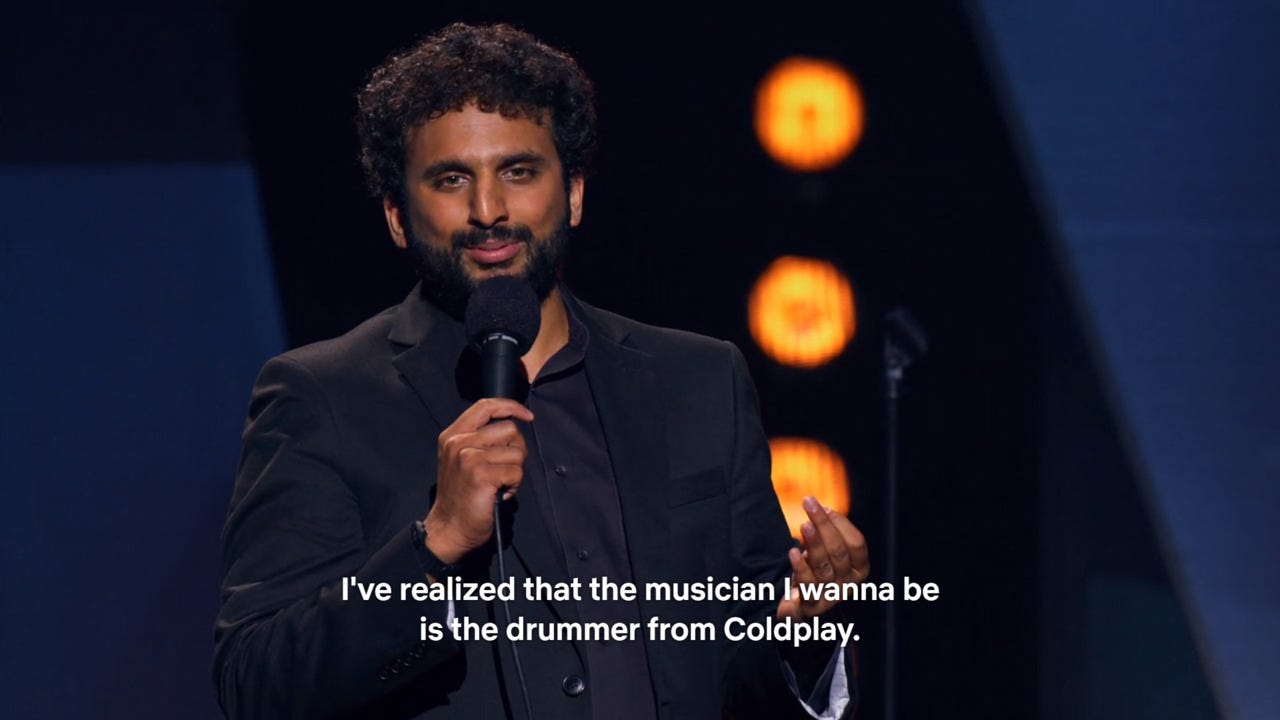 Nish Kumar’s bit continues, “I wanna be the drummer from Coldplay so bad, ‘cause that dude’s rich as shit, and no one knows who the fuck he is.”